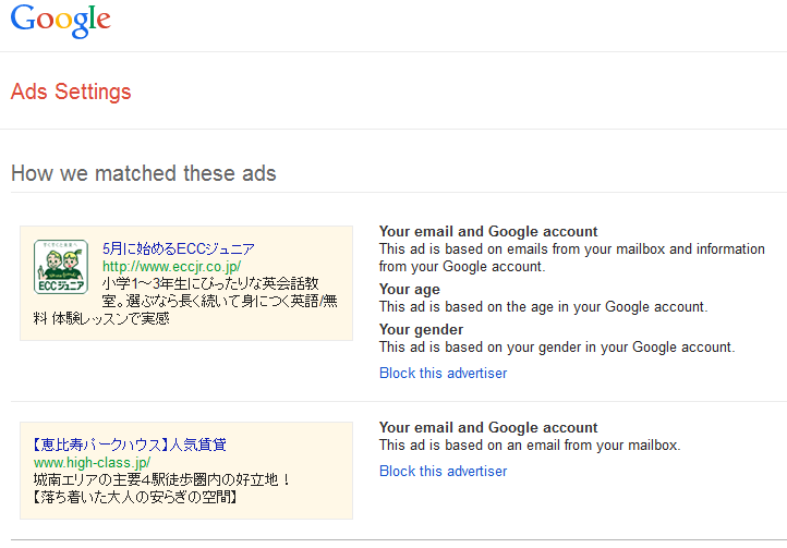 Ads Settings のページに戻ってみる。
