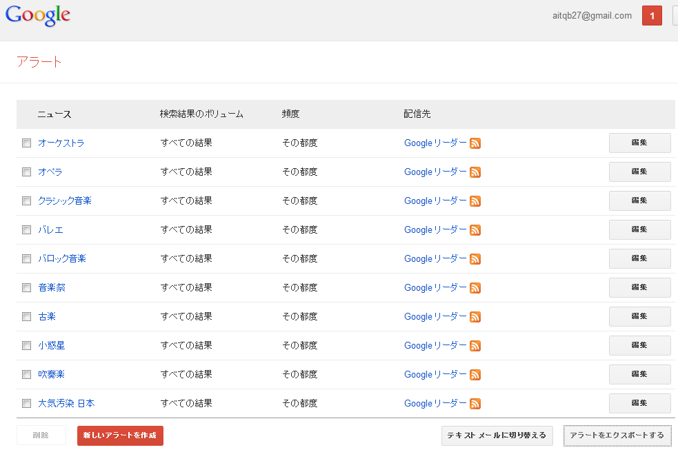 http://www.google.co.jp/alerts/manage?hl=ja ところで、初めて訪れたはずのこのアラート管理画面にすでにいろんなキーワードが登録されてたのが不思議でよくよく思い出してみたら、これらのキーワード、Google Homepage を使ってた頃そのホームページ上のガジェットでニュース取得していたものたちでした。